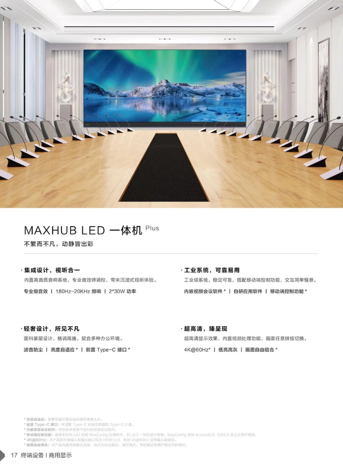 MAXHUB是视臻科技的自主*,诞生于2017年,是国内会议平板品类的开创者和引领者,来自第三方奥维的数据显示,2022年MAXHUB销量市占率达28.8%。截至目前,MAXHUB已成功走进全球78个*,超50万间会议室都能看到MAXHUB的身影,超80%中国500强企业都在使用MAXHUB提升会议和协同效率*。 创新成就更多可能,MAXHUB持续根据用户需求迭代升级技术和产品。2023年,MAXHUB首度在行业内定义三大空间,发布三大空间数字化解决方案,以覆盖全场景的协同终端新品,为组织带来更高效的会议办公体验。 服务无止境,满意无终点。MAXHUB始终坚持以“用户为中心”,拥有完善的售后体系,2000个售后服务网点和10000名官方认证工程师,为全国用户提供设备咨询、送货、安装、培训、维修等*专业服务,对 于一、二线城市,还提供48小时内上门服务,真正做到“只要有MAXHUB的地方,就会有 MAXHUB的服务”。 打造更好的产品,追求更高的品质,提供更优的服务,MAXHUB将致力于提升协同共创的效能,把高效转化为企业的核心生产力,为社会创造更大的价值。